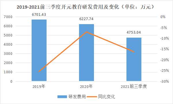 自2019年以來,開元教育的研發(fā)費用持續(xù)下降。2021年前三季度開元教育研發(fā)費用僅為4753.04萬元,同比下降16.27%。和動輒數(shù)億的銷售費用相比,研發(fā)投入還遠(yuǎn)遠(yuǎn)不夠,“重營銷,輕研發(fā)”的標(biāo)簽還無法摘去。
