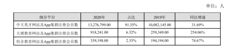 在線業(yè)務(wù)方面,2020年,開元教育線上平臺注冊會員數(shù)超過1453.42萬人,其中九成都是中大英才的線上注冊會員,天琥教育和恒企教育的線上用戶加起來僅占比8.65%。2020年,開元教育在線招生人數(shù)113.63萬,同比增長102.57%,但受客單價影響,在線教育業(yè)務(wù)營收卻同比下降14.56%。