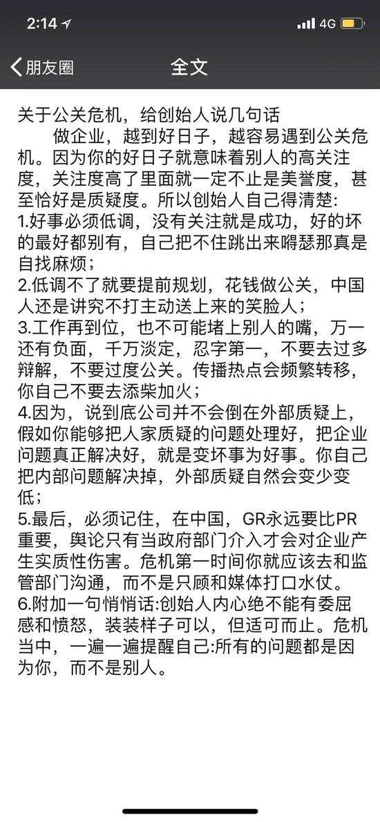 他表示,公司越到好日子,越容易出現(xiàn)公關(guān)危機(jī),“但是創(chuàng)始人內(nèi)心絕不能有委屈感和憤怒,裝裝樣子可以,但適可而止。危機(jī)當(dāng)中,一遍一遍提醒自己:所有的問題都是因?yàn)槟悖皇莿e人?!?/p>