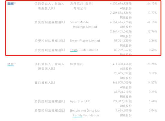 新浪港股查詢發(fā)現(xiàn),雷軍持有1)Smart Mobile Holdings Limited所 持4,254,616,928股A類股份及2,264,455,542股B類股份 ;及2)Smart Player Limited所持59,221,630股B類股份 ;及3)Team Guide Limited所 持83,209,362股B類股份的權益。簡而言之,就是雷軍合計持有42.546億股A類股,持有24.067億股B類股,雷軍合計持有小米66.62億股,持股小米27.69%的股權。