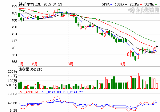 盤面看,昨日鐵礦石期貨主力1509合約開盤放量上沖,10時30分加速上揚,午后封漲停399元/噸(64美元)。近月1505合約早盤漲停,在過去的八個交易日中七日收陽。螺紋鋼1510合約強勢上攻,重新奪回2300點關(guān)口。昨日新加坡鐵礦石期貨亦跳漲。交投最活躍的6月鐵礦石合約大漲3.9%至每噸51.35美元。