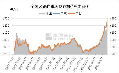 根據(jù)卓創(chuàng)資訊數(shù)據(jù)監(jiān)測,截至2月22日,國內(nèi)43蛋白豆粕均價為4462元/噸,較年初價格累計漲幅25.48%。其中兩廣市場豆粕均價為4638元/噸,較年初累計漲幅達31.76%,表現(xiàn)十分搶眼?;罘矫鎭砜?,年初廣西地區(qū)油廠現(xiàn)貨基差主流成交價格在2205+350元/噸左右,春節(jié)假期后短短兩周時間,廣西地區(qū)現(xiàn)貨基差直奔“千元大關”,成功實現(xiàn)了價格洼地到高度升水的逆襲。