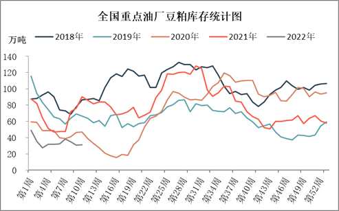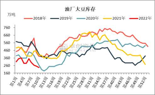 根據(jù)卓創(chuàng)資訊數(shù)據(jù)統(tǒng)計(jì),截至3月11日當(dāng)周,國內(nèi)重點(diǎn)油廠原料大豆庫存連續(xù)第五周下降,數(shù)值為234.98萬噸,環(huán)比減少17.47萬噸,同比減少163.32萬噸。由于原料供應(yīng)改善不佳,國內(nèi)油廠豆粕庫存也難以積累。根據(jù)卓創(chuàng)資訊監(jiān)測的99家重點(diǎn)油廠豆粕庫存情況來看,截至3月11日當(dāng)周,國內(nèi)豆粕庫存為31.37萬噸,為近五年同期最低水平。根據(jù)市場預(yù)估,4月進(jìn)口大豆到港量約為900-950萬噸,供應(yīng)端恢復(fù)預(yù)期較強(qiáng)。