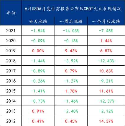 二、近十年USDA6月供需報告發(fā)布對CBOT大豆行情的影響
