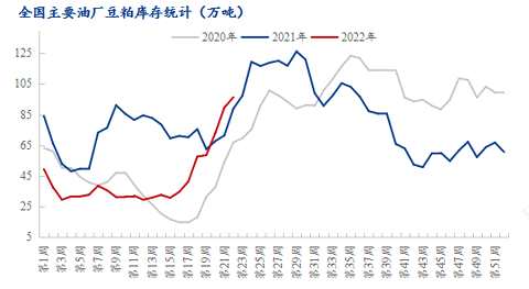 近期國內(nèi)豆粕期價隨美豆上漲,現(xiàn)貨價格被動抬升。由于6月份大豆到港量超預(yù)期,油廠大豆、豆粕庫存仍然處于高位,國內(nèi)豆粕處于去庫存階段,但受到美豆高成本支撐,國內(nèi)油廠壓榨利潤不佳,上游挺價情緒濃厚。據(jù)Mysteel數(shù)據(jù)顯示:2022年第22周,全國主要油廠大豆庫存及豆粕庫存、未執(zhí)行合同均上升。其中大豆庫存為512.54萬噸,較上周增加26.14萬噸,增幅5.37%,豆粕庫存為96.28萬噸,較上周增加6.68萬噸,增幅7.46%。