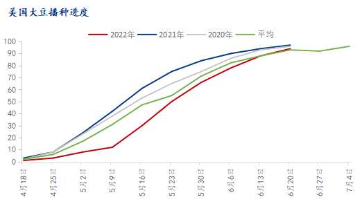 截至6月19日,美國大豆播種進度為94%,超過五年同期均值為93%,上周88%,去年同期97%。在早前3月底USDA美豆種植意向報告發(fā)布中,預(yù)測2022/23年新作美豆為9095.5萬英畝,目前大豆優(yōu)良率為68%超給去年同期的60%,上周70%。在天氣一路順暢的情況下,9095.5萬英畝加上大豆優(yōu)良率良好,新作豐產(chǎn)為大概率事件,而在本月底USDA公布最終的美豆種植面積預(yù)期將超給前三年,利空消息籠罩市場,盤面隨之下跌。