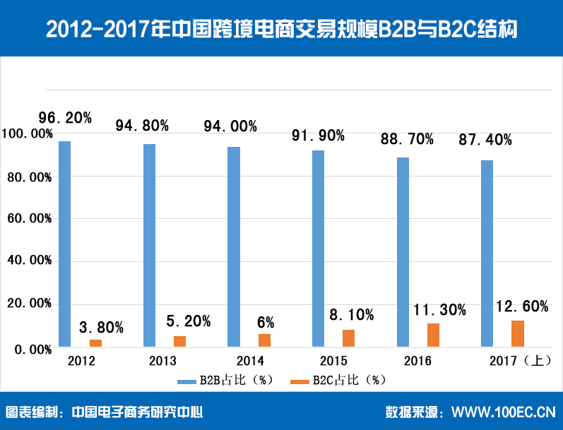 據(jù)中國電子商務(wù)研究中心監(jiān)測數(shù)據(jù)(100EC.CN)顯示,2017上半年中國跨境電商的交易模式跨境電商B2B交易占比達(dá)87.4%,B2B交易占據(jù)絕對優(yōu)勢,跨境電商B2C交易占比12.6%。