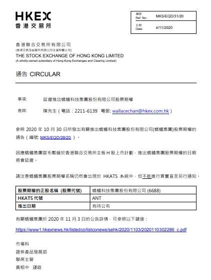 港交所公告,因應(yīng)螞蟻集團(tuán)宣布暫緩于香港聯(lián)合交易所主板H股上市計(jì)劃,推出螞蟻集團(tuán)股票期貨的日期將會(huì)延遲。