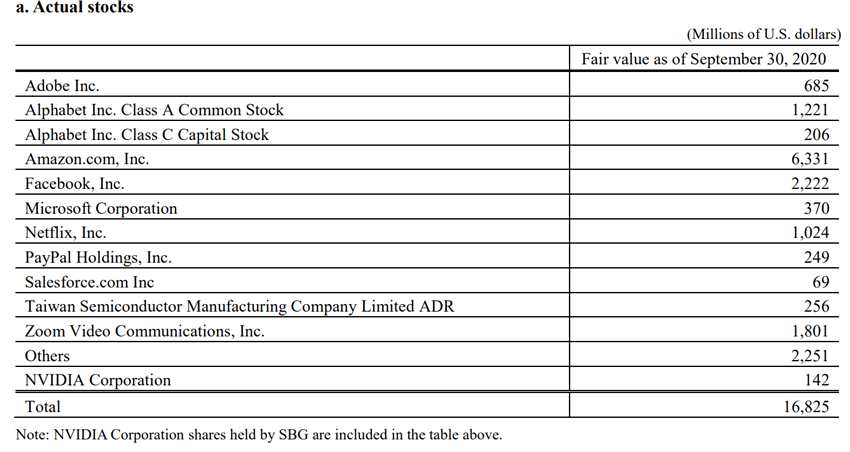 在半年報(bào)中,軟銀同時(shí)公布了股票市場的投資情況,截至三季度末總共持有價(jià)值168億美元的股票,其中持倉市值前三的股票分別是亞馬遜(63.31億美元)、Facebook(22.22億美元)和Zoom(18.01億美元)。