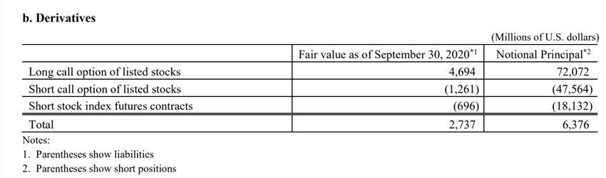 軟銀披露,截至九月底公司投資業(yè)務(wù)期貨和期權(quán)累積公允價(jià)值為27.37億美元,其中做多上市公司看漲期權(quán)的持倉價(jià)值為46.94億美元,對(duì)應(yīng)名義本金為720.72億美元;做空看漲期權(quán)的公允價(jià)值為負(fù)12.63億美元,對(duì)應(yīng)名義本金為負(fù)475.64億美元;做空股指期貨合約的公允價(jià)值為負(fù)6.96億美元,對(duì)應(yīng)名義本金為負(fù)181.32億美元。