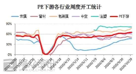 10月國內(nèi)聚乙烯下游整體開工呈上漲趨勢,據(jù)隆眾統(tǒng)計,10月份國內(nèi)PE下游平均開工率64.0%,較上月增長2.9個百分點。其中農(nóng)膜行業(yè)月均開工45.8%,較上月增6.8個百分點;管材月均開工51.8%,較上月增1.0個百分點;包裝膜月均開工73.1%,較上月增2.8個百分點;中空月均開工60.5%,較上月增1.9個百分點;注塑月均開工81.3%,較上月持平。