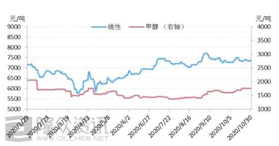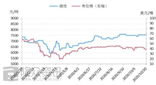 上下游相關(guān)產(chǎn)品:本月國際油價整體呈現(xiàn)下行趨勢。歐美疫情持續(xù)惡化,法國及德國再次宣布全國實施封城舉措加重市場對于需求前景的擔(dān)憂。截至10月29日收盤,WTI區(qū)間36.17-41.46美元/桶,布倫特37.65-43.34美元/桶,預(yù)計WTI或在35-43美元/桶的區(qū)間運(yùn)行,布倫特或在37-45美元/桶的區(qū)間運(yùn)行,對聚乙烯價格仍有支撐。