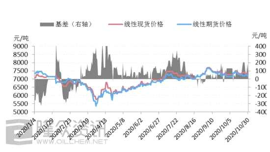 截止10月29日,L主力合約價格環(huán)比下跌,期價收盤7185元/噸,成交量32.62萬手,持倉25.71萬手;基差365元/噸,+75元/噸;1-5價差40元/噸。目前原油價格繼續(xù)下探,上游企業(yè)庫存環(huán)大幅下降,中間貿(mào)易商庫存同比相當(dāng),下游需求支撐力度較為有限。操作上,建議操作者逢高沽空為宜,中長期關(guān)注高壓和線性價差收窄機(jī)會。
