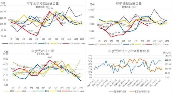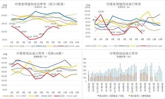 從10月上旬印度溶劑萃取商協(xié)會(huì)(SEA)發(fā)布報(bào)告稱,截至9月底,印度植物油總庫(kù)存160.2萬(wàn)噸,環(huán)比小幅下降-7.5%,為同期低位。其中港口庫(kù)存58.2萬(wàn)噸,較7月大幅下滑,主要由于九月植物油進(jìn)口量環(huán)比-20%。其中棕油進(jìn)口量環(huán)比-12%,月進(jìn)口量低于五年均值,港口庫(kù)存40萬(wàn)噸,與16年庫(kù)存低位持平。印度植物油庫(kù)存和棕油庫(kù)存均有補(bǔ)庫(kù)空間,數(shù)據(jù)利多;