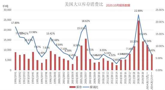 10月USDA報(bào)告:預(yù)估201/21美豆單產(chǎn)51.9,9月51.9,去年47.4,市場(chǎng)預(yù)估區(qū)間51.2-52.5;產(chǎn)量4268百萬(wàn)蒲式耳,8月4313,去年3552,預(yù)估區(qū)間4192-4350,;變化較大的是出口,預(yù)估20/21年度美豆出口2200,9月2125,去年1676;預(yù)估20/21庫(kù)存290百萬(wàn)蒲式耳,9月預(yù)估460,去年523,市場(chǎng)預(yù)估區(qū)間285-460,庫(kù)存接近市場(chǎng)預(yù)估區(qū)間下沿。庫(kù)存消費(fèi)比預(yù)估6.43%,9月預(yù)估10.34%,去年13.24%。