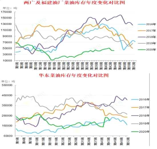 中國(guó)國(guó)內(nèi)的豆油庫(kù)存已經(jīng)開始季節(jié)性下滑,且整體庫(kù)存不算高,大豆的進(jìn)口高峰已經(jīng)過(guò)去,庫(kù)存一般會(huì)持續(xù)下滑到次年的4-5月。棕油和菜油庫(kù)存仍舊處于同期偏低水平。就庫(kù)存水平來(lái)講,棕油和菜油庫(kù)存已經(jīng)脫離了極低區(qū)域,向均值水平靠近,但總體仍然偏低,且均低于19年水平??傮w來(lái)講國(guó)內(nèi)的油脂庫(kù)存水平仍然是偏低的水平,但整體的緊張水平較前期有所緩解。