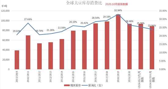 全球大豆庫(kù)存8870萬(wàn)噸,9月預(yù)估9358,去年9375萬(wàn)噸。20/21全球庫(kù)存消費(fèi)比23.94%,低于9月預(yù)估的25.36%,也低于去年的26.46%。全球大豆庫(kù)存消費(fèi)比預(yù)計(jì)下滑至15年熊市以來(lái)最低;但仍高于11-14的牛市水平。