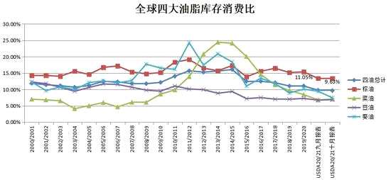 從全球油脂來(lái)看,預(yù)計(jì)20/21全球棕油庫(kù)存消費(fèi)比13.37%,9月預(yù)估13.34%,去年15.35%;豆油庫(kù)存消費(fèi)比預(yù)估6.81%,9月預(yù)估6.71%,去年7.23%;菜油7.01%,9月預(yù)估6.76%,去年8.42%;主要4種油脂預(yù)估9.63%,9月預(yù)估9.75%,去年11.05%。三種主要油脂的庫(kù)存消費(fèi)比仍然處于2000以來(lái)的低位,但較9月預(yù)估值都增加,供應(yīng)緊張程度預(yù)計(jì)有緩解;全球的庫(kù)存消費(fèi)比較9月消化,因?yàn)榭蛶?kù)存下滑較多??傮w油脂庫(kù)存消費(fèi)比仍然利于做多;