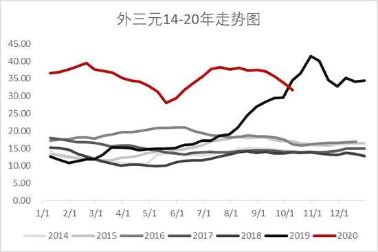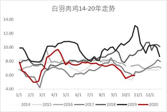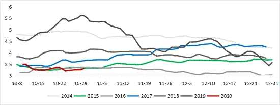 時(shí)間進(jìn)入11月,在供給端確定性明顯增加的背景下,對(duì)于季節(jié)性消費(fèi)的判斷,市場(chǎng)仍在摸索當(dāng)中,各種因素之中,“雙十一”是我們需要重點(diǎn)考慮的。從11月的蛋價(jià)走勢(shì)圖來(lái)看,除19年受到淘汰雞影響導(dǎo)致價(jià)格的大幅波動(dòng)之外,其余年份的波動(dòng)并不大,而在這不大的波動(dòng)中,卻可以分離出重要的特征,那就是11月的蛋價(jià)走勢(shì)很大程度上預(yù)示了春節(jié)前的價(jià)格方向和春節(jié)的蛋價(jià)高度。而“雙十一”前的備貨和“雙十一”后的支撐,也是11月蛋價(jià)方向的分水嶺。