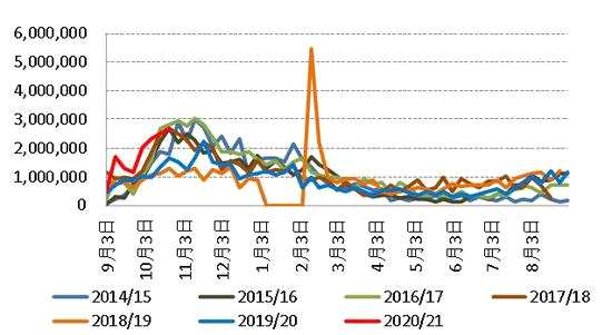 原料供應(yīng)充裕,油廠大豆壓榨量持續(xù)在高位,而水產(chǎn)養(yǎng)殖逐步進入淡季,南方部分油廠出現(xiàn)脹庫停機且催提狀況,經(jīng)過前兩周積極補庫之后,中下游以消化庫存為主,采購心態(tài)趨于謹慎,導(dǎo)致本周成交量大幅低于上周。截止10月30日當周,豆粕總成交量75.62萬噸,較上周202.66萬噸,周比降62.69%,較去年同期273.01萬噸減少72.30%。