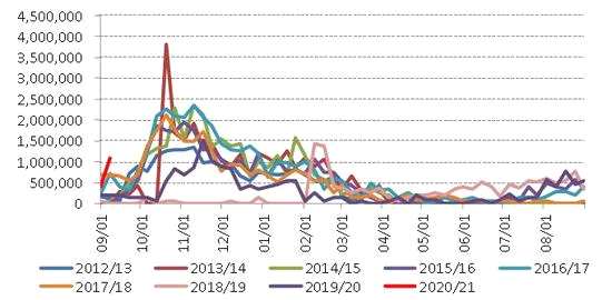 目前蛋雞養(yǎng)殖行業(yè)普遍進入虧損狀態(tài),截止30日,蛋雞養(yǎng)殖利潤為-5.56元/只,較上周的-8.64增加了3.08元/只;較去年同期的125.12減少了130.68元/只,減幅為104.44%。養(yǎng)殖利潤不斷下降,養(yǎng)殖戶補欄心態(tài)較弱,加上水產(chǎn)養(yǎng)殖10月份之后逐步進入淡季,均利空粕類需求。