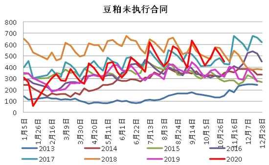 圖:豆粕庫存及未執(zhí)行合同(單位:萬噸)