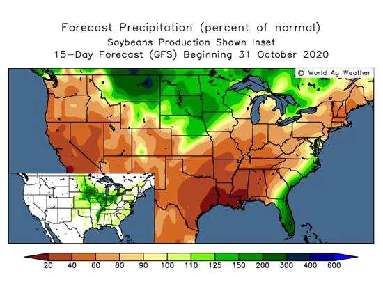 美國農(nóng)業(yè)部發(fā)布的作物進展周報顯示,截至2020年10月25日的一周,美國中西部地區(qū)適合農(nóng)田作業(yè)的天數(shù)減少。伊利諾伊州適合農(nóng)田作業(yè)的天數(shù)為4.3天,一周前6.4天,去年同期5.1天;印第安納州適合農(nóng)田作業(yè)的天數(shù)為4.0天,一周前5.8天,去年同期4.9天。衣阿華州適合農(nóng)田作業(yè)的天數(shù)為3.8天,一周前6.4天,去年同期為4.1天??八_斯,適合農(nóng)田作業(yè)的天數(shù)為6.0天,一周前6.9天,去年同6.3天。俄克拉荷馬州適合農(nóng)田作業(yè)的天數(shù)為6.2天,一周前6.6天,去年同期5.2天。得克薩斯州適合農(nóng)田作業(yè)的天數(shù)為6.3天,一周前6.4天,去年同期5.5天。