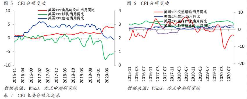 環(huán)比分項來看,核心CPI回落是整體通脹環(huán)比下降的核心影響因素。具體來看,服裝和醫(yī)療保健分項分別拖累10月CPI 0.04和0.03個百分點;而交通運輸項、能源項和住宅項對CPI雖然形成正向拉動,但是勞動作用較前值分別下滑0.15、0.05和0.05個百分點,成為CPI回落且表現(xiàn)不及預(yù)期的核心影響因素。交通運輸項和能源項的下滑符合預(yù)期,這與歐美疫情的持續(xù)惡化和新一輪財政刺激措施的困境有直接關(guān)系,而因超低利率和高儲蓄率(美國直接派發(fā)現(xiàn)金影響)導(dǎo)致的火熱的房地產(chǎn)市場趨于平穩(wěn),這與住宅項的環(huán)比邊際放緩密切相關(guān)。另外,食品、娛樂與教育與通信項等項表現(xiàn)有韌性,在一定程度上降低了通脹的下滑幅度,保證了整體通脹的相對穩(wěn)定性。