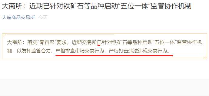 對此,大連商品交易所深夜表態(tài)稱,落實“零容忍”要求,近期交易所已針對鐵礦石等品種啟動“五位一體”監(jiān)管協(xié)作機制,以發(fā)揮監(jiān)管合力,嚴格排查市場交易行為,嚴厲打擊違法違規(guī)交易行為。