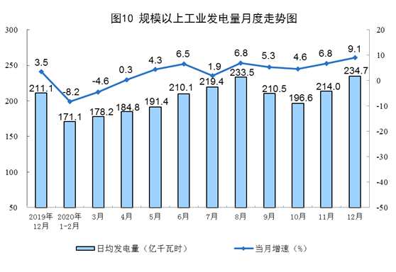 電力生產(chǎn)增速繼續(xù)加快。12月份,發(fā)電量7277億千瓦時,同比增長9.1%,增速比上月加快2.3個百分點;日均發(fā)電234.7億千瓦時,環(huán)比增加20.7億千瓦時。2020年,發(fā)電量74170億千瓦時,比上年增長2.7%。