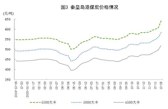 港口煤炭綜合交易價格上漲。12月25日,秦皇島港5500大卡、5000大卡和4500大卡動力煤綜合交易價格分別為每噸642元、583元和519元,比11月27日分別上漲56元、50元和45元。