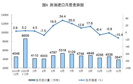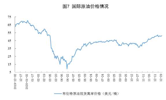原油進口降幅擴大,國際原油價格繼續(xù)上漲。進口原油3847萬噸,環(huán)比減少689萬噸,同比下降15.4%,降幅比上月擴大14.6個百分點;2020年,進口原油5.4億噸,比上年增長7.3%。12月31日,布倫特原油現(xiàn)貨離岸價格為51.22美元/桶,比11月30日的46.84美元/桶上漲9.4%。