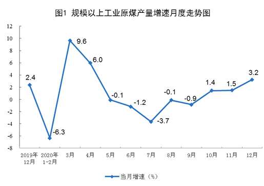 原煤生產(chǎn)有所加快。12月份,生產(chǎn)原煤3.5億噸,同比增長3.2%,增速比上月加快1.7個百分點;日產(chǎn)1135萬噸,環(huán)比減少23萬噸。2020年,生產(chǎn)原煤38.4億噸,比上年增長0.9%。