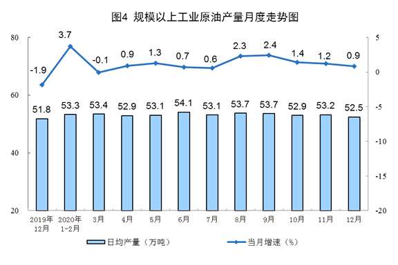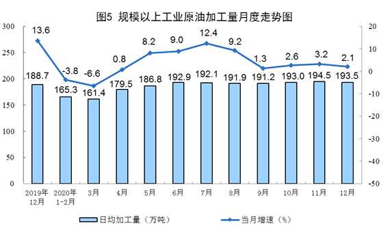 原油生產(chǎn)增速略有放緩。12月份,生產(chǎn)原油1627萬噸,同比增長0.9%,增速比上月回落0.3個百分點;日產(chǎn)52.5萬噸,環(huán)比減少0.7萬噸。加工原油6000萬噸,同比增長2.1%,比上月回落1.1個百分點。2020年,生產(chǎn)原油1.95億噸,比上年增長1.6%;加工原油6.7億噸,增長3.0%。