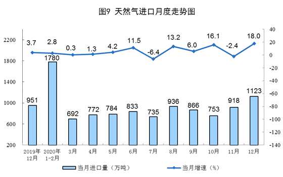 天然氣進口由降轉(zhuǎn)增。12月份,進口天然氣1123萬噸,同比增長18.0%,上月為下降2.4%。2020年,進口天然氣1.02億噸,比上年增長5.3%。