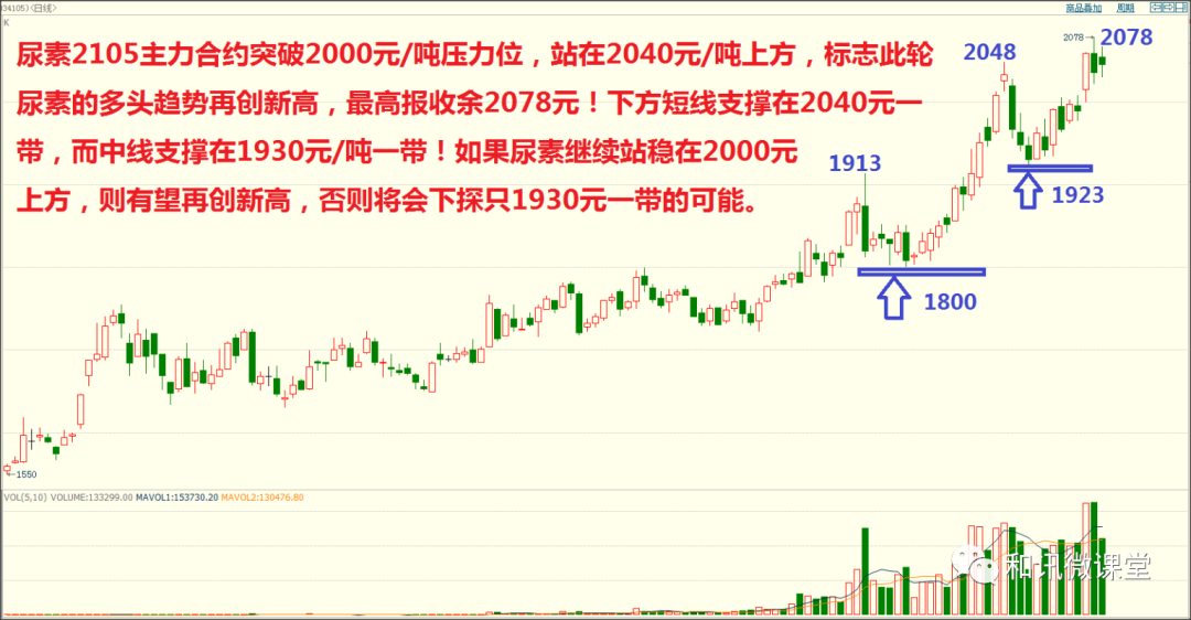近期國內市場主要受到低開工、低庫存、下游持續(xù)性補庫影響,價格不斷走高,其中部分地區(qū)現(xiàn)貨價格達到了2160~2170元/噸。受全球農作物擴種等影響,國際市場尿素價格也不斷攀升,對國內尿素期價有良好的帶動作用。預計短期尿素期貨價格繼續(xù)維持強勢局面,理性回調低點可作為多單入場時機,主力合約第一目標價位前期高點2048元/噸。但是考慮到穩(wěn)定農業(yè),保護糧食安全等農產品(000061,股吧)的調控,過快過高的漲幅不利于種植戶,因此盡管前期積累的較高的漲幅,但是今年有面臨政策性調控的風險,也在也難免,需要投資高度重視!