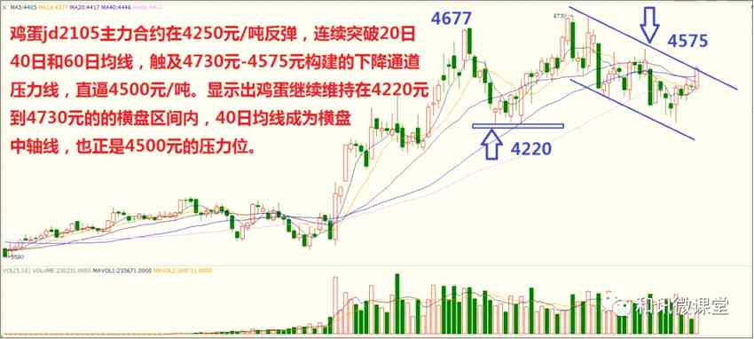 雞蛋jd2105主力合約在4250元/噸反彈,連續(xù)突破20日40日和60日均線,觸及4730元-4575元構(gòu)建的下降通道壓力線,直逼4500元/噸。顯示出雞蛋繼續(xù)維持在4220元到4730元的的橫盤區(qū)間內(nèi),40日均線成為橫盤中軸線,也正是4500元的中軸線。交易者需要密切關(guān)注在4300元下方的支撐和4670元上方的壓力位作為止損或者止盈的參考點(diǎn)。在沒有突破4700元上方之前難以走出大多頭結(jié)構(gòu),同理不跌破4220元也走不出空頭結(jié)構(gòu)。