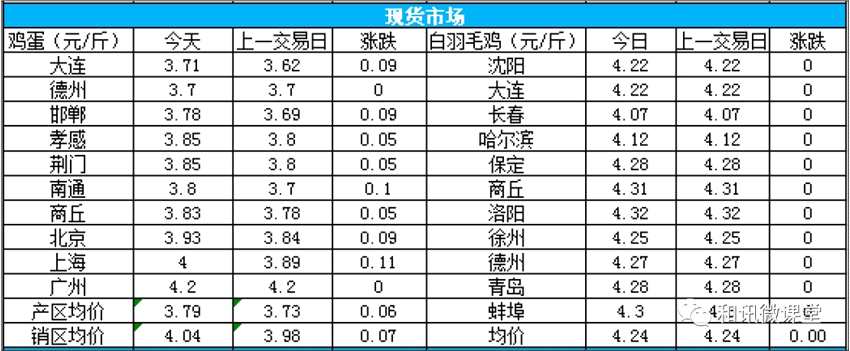 全國行情穩(wěn)中依然有漲, 產(chǎn)區(qū)北京周邊市場走貨正常繼續(xù)跟隨北京上漲,主產(chǎn)區(qū)雞蛋價格 3.79 元/斤,較前一交易日價格漲 0.06,主銷區(qū)雞蛋價格 4.04 元/斤,較前一交易日價格漲 0.07。
