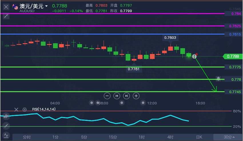 澳元兌美元在轉(zhuǎn)折點(diǎn)0.7815下方看跌,第一支撐位為0.7775,第二支撐位為0.7760;若澳元兌美元回升至0.7815上方,則看漲,阻力位為0.7825和0.7840。
