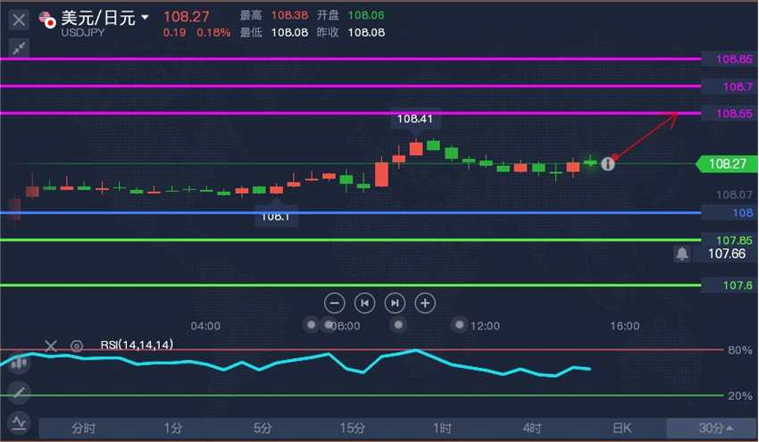 美元兌日元在轉(zhuǎn)折點(diǎn)108.00上方看漲,阻力位為108.55和108.70;若美元兌日元回落至108.00下方,則看空,支撐位為107.85和107.60。
