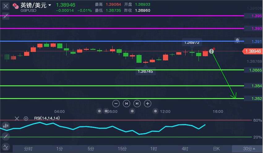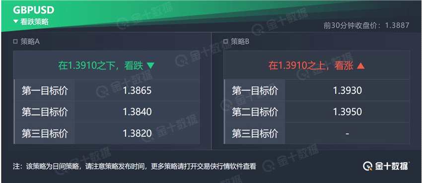 英鎊兌美元多空轉(zhuǎn)折點(diǎn)為1.3910,目前鎊美在轉(zhuǎn)折點(diǎn)下方看跌,支撐位為1.3865和1.3840;若鎊美回升至1.3910上方,則看漲,阻力位為1.3930和1.3950。