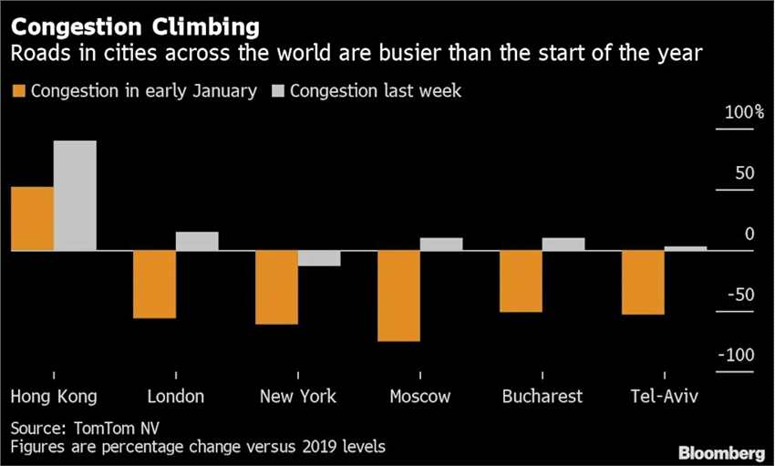 根據(jù)主營導航設(shè)備的公司TomTom NV提供的數(shù)據(jù),目前中國香港街頭的交通擁堵程度已經(jīng)是2019年的兩倍,特拉維夫、莫斯科和布加勒斯特的街道現(xiàn)在也都比疫情大流行之前更加繁忙。