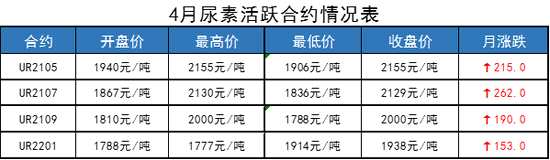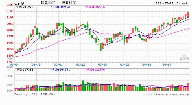 期貨市場(chǎng)走勢(shì)與現(xiàn)貨市場(chǎng)相似,05合約僅下跌兩天,4月6日達(dá)到月內(nèi)最低點(diǎn)1906元/噸后開始反彈回升,4月20日達(dá)到月內(nèi)高點(diǎn)2095元/噸后05合約便開始有所松動(dòng),4月26日晚印度MMCT公司發(fā)布新一輪的招標(biāo),市場(chǎng)預(yù)計(jì)此次招標(biāo)量或超過150萬,期現(xiàn)貨市場(chǎng)又開始止跌回升,4月30日臨近收盤,尿素期貨合約全線大漲,05合約創(chuàng)下上市以來的最高點(diǎn)2155元/噸,07合約也刷新最高點(diǎn)。值得注意的是,本月尿素尿素期貨主力合約換至07合約,這是尿素期貨上市以來,主力合約首次換至07合約。