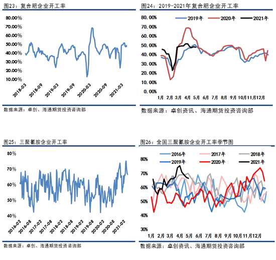歷年的4月份是復(fù)合肥企業(yè)生產(chǎn)的旺季,,上半月復(fù)合肥企業(yè)開工率較高,但下月半開始開工率又開始回調(diào),截至4月29日,復(fù)合肥企業(yè)的開工率為47.64%,除預(yù)售訂單外,整個(gè)4月份對(duì)尿素需求最大的要數(shù)復(fù)合肥了,五一假期后夏季高氮肥逐漸啟動(dòng),隨著訂單逐步收單,預(yù)計(jì)5月份復(fù)合肥企業(yè)開工率維持高位,下旬或?qū)⒂兴芈?。工業(yè)方面,三聚氰胺的企業(yè)維持高開工,截至4月29日,三聚氰胺企業(yè)的開工率為66.42%,較3月底下滑7.52個(gè)百分點(diǎn),目前仍處于歷史同期較高位置。由于目前整個(gè)宏觀環(huán)境的趨好,預(yù)計(jì)短期內(nèi)三聚氰胺企業(yè)維持高開工率,但從5月下旬開始南方梅雨天機(jī)逐漸增多,或?qū)?duì)工業(yè)開工稍有影響。