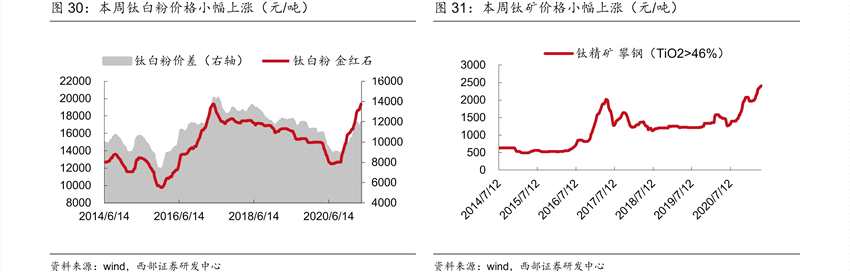 自2020年7月開始,鈦白粉突破疫情阻礙打開海外市場之后,價格自低位反彈,至年底價格漲幅近30%。五一長假前,鈦白粉報價就已沖破20000元,節(jié)前最后一周,龍蟒佰利(002601,股吧)金紅石型(R2型)鈦白粉價格站穩(wěn)20600元/噸。而作為鈦白粉龍頭,龍蟒佰利的報價往往先于鈦白粉新一輪的漲價潮。