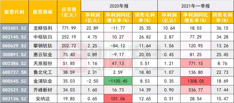 2020年,受上半年疫情影響,鈦白粉主要核心概念股全年業(yè)績同比增長表現(xiàn)較為平淡。但最新公布的一季報數(shù)據(jù)顯示,鈦白粉概念股均實現(xiàn)了15%以上的凈利潤同比增長。更有如金浦鈦業(yè)者,2020年一季報扭虧的同時,實現(xiàn)同比大幅增長。