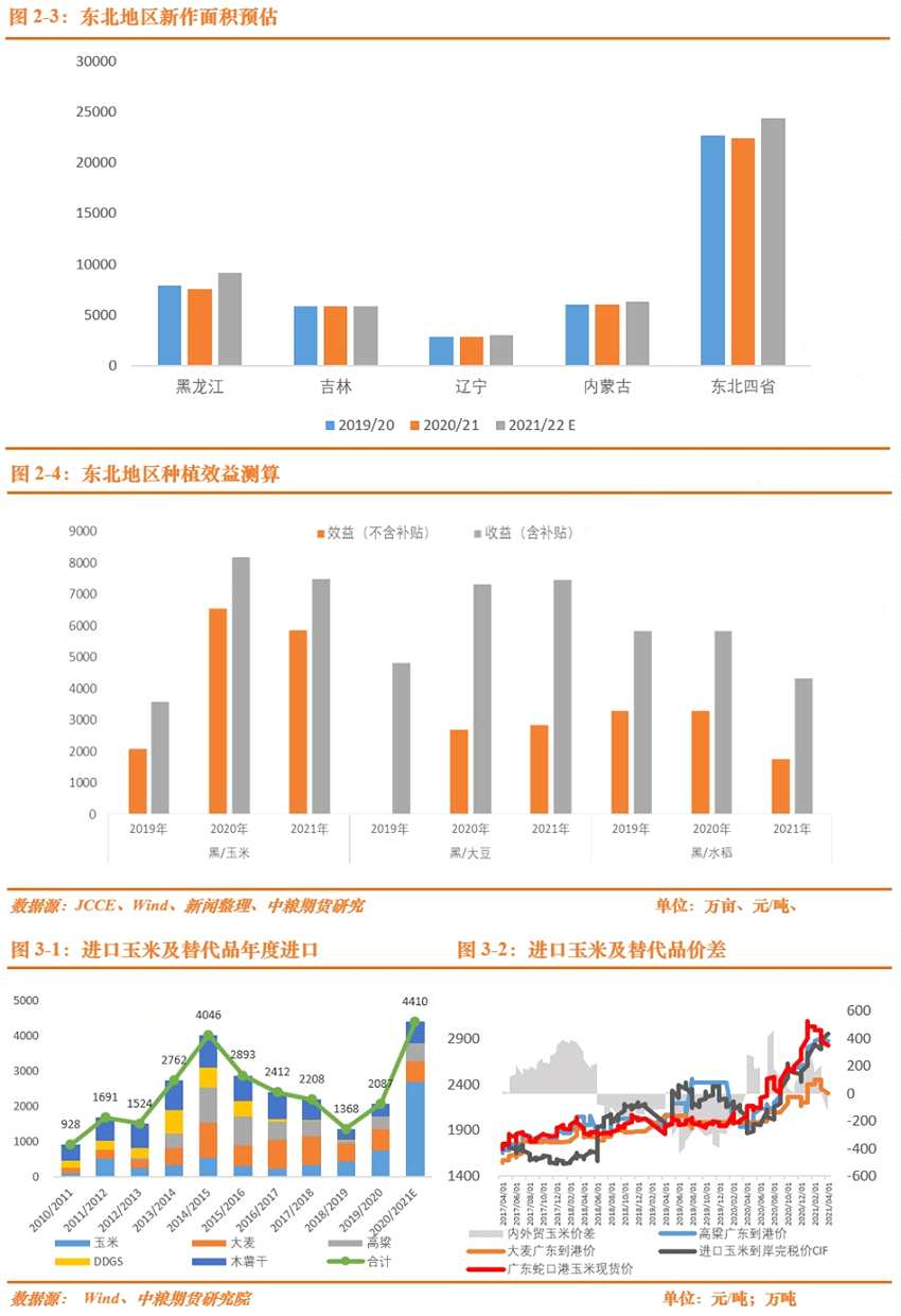官方文件提出2021年玉米面積恢復(fù)1000萬畝的目標,市場普遍預(yù)估在1000萬-3000萬畝的恢復(fù)面積,對此,筆者仍維持謹慎觀點。初步估算,新增面積更多在黑、蒙地區(qū),包括一部分大豆改種、一部分新增其他雜糧面積替代,此外還有一部分水地改旱地的面積,預(yù)估東北三省一區(qū)最大極限新增10%面積,對應(yīng)約有2200萬畝新增面積,對應(yīng)1000萬噸的新增產(chǎn)量,但前提是天氣正常。通過種植面積恢復(fù)對下一年度的新增供應(yīng)邊際效益有限。除了面積因素外,今年東北主產(chǎn)區(qū)的種植成本普遍提升,主要是地租成本的提升,筆者按照地租漲幅30-40%,其他成本上漲10-20%測算,折算干糧成本增幅在250-300元/噸,這也將對遠期1月合約有一定支撐。以黑龍江為例,按照潮糧單產(chǎn)9噸/公頃折算,算上脫粒費、短運費、烘干費、出庫費、集港運費,折算集港成本在2550-2600元/噸,因此1月合約目前處于偏低估水平。當然,面積恢復(fù)水平仍待春耕時調(diào)研進一步驗證。