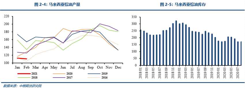 進(jìn)入2021年之后,棕櫚油產(chǎn)地印尼和馬來(lái)西亞天氣正常,對(duì)產(chǎn)量的影響有限,預(yù)計(jì)將以季節(jié)性規(guī)律正常增長(zhǎng),供應(yīng)端壓力將會(huì)逐漸凸顯,缺乏對(duì)價(jià)格的利多支撐。與國(guó)內(nèi)不同的是,印尼和馬來(lái)西亞的新冠肺炎疫情還未得到控制,勞動(dòng)力短缺的因素已經(jīng)在很長(zhǎng)一段時(shí)間內(nèi)持續(xù),因此在后期此因素很難再讓市場(chǎng)對(duì)此有實(shí)質(zhì)反應(yīng),當(dāng)勞動(dòng)力恢復(fù)之后,產(chǎn)量的恢復(fù)還有可能會(huì)加快。