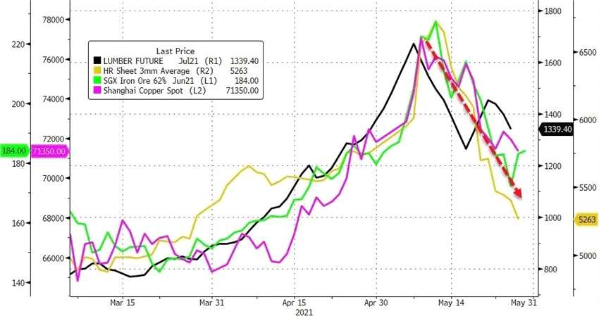 然而,正如近期眾多工業(yè)金屬(和木材)從高峰期迅速下跌所表明的那樣,主要由投機推動的大宗商品價格上漲也容易出現(xiàn)突然逆轉(zhuǎn),因此通脹主義者的論點可能不像最初那么強烈出現(xiàn),爭論遠未結(jié)束。