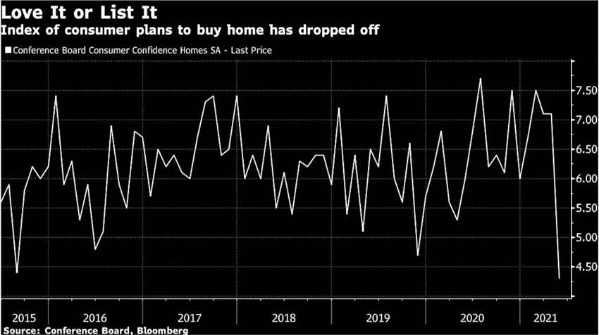 以木材為例,木材是過去一年里上漲幅度最大的大宗商品之一,因?yàn)槔г诩抑械拿绹藢⒏噘Y金投入到了生活環(huán)境的改造中。然而自5月觸及峰值以來,木材價格已經(jīng)重挫了40%。喧囂的房地產(chǎn)市場也有所降溫,衡量消費(fèi)者購房計(jì)劃的指數(shù)在上個月出現(xiàn)大跌。此外,銅價也開始從歷史高位回落。